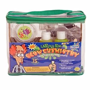 Product Description : From the ManufacturerSet up your own glow-in-the-dark lab as you make a batch o glowing slime, Insta-Worms, and turn long polymers into liquid light. Illuminate your worms and the slime with the UV blacklight that is included. Write a secret glow-in-the-dark message. Product Description : BE AMAZING TOYS-Glow Chemistry Lab in a Bag. Make your own glowing slim; grow atomic worms and explore the science of things that glow! This kit includes more than 15 activities; atomic worm goo; UV light; worm activator; atomic slime; plastic scoop; shaker cup; slime goo activator and instructions. Recommended for ages 8 and up. WARNING: CHOKING HAZARD-Small Parts. Not for children under 3 years. WARNING: This set contains chemicals that may be harmful if misused. Use only with adult supervision. Conforms to ASTM F963. Imported.