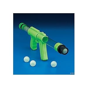 Product Description : Kids will have a blast engaging in gun fights against aliens and one another with this 19" pump action gun. Guns fire soft 1" plastic balls and glows in the dark. Green. Comes with 12 balls.1 Gun19" Pump action gunComes with 12 one inch plastic ballsGlows in the dark- 11 ouncesManufacturer Recomended Age: 36 months - 18 years